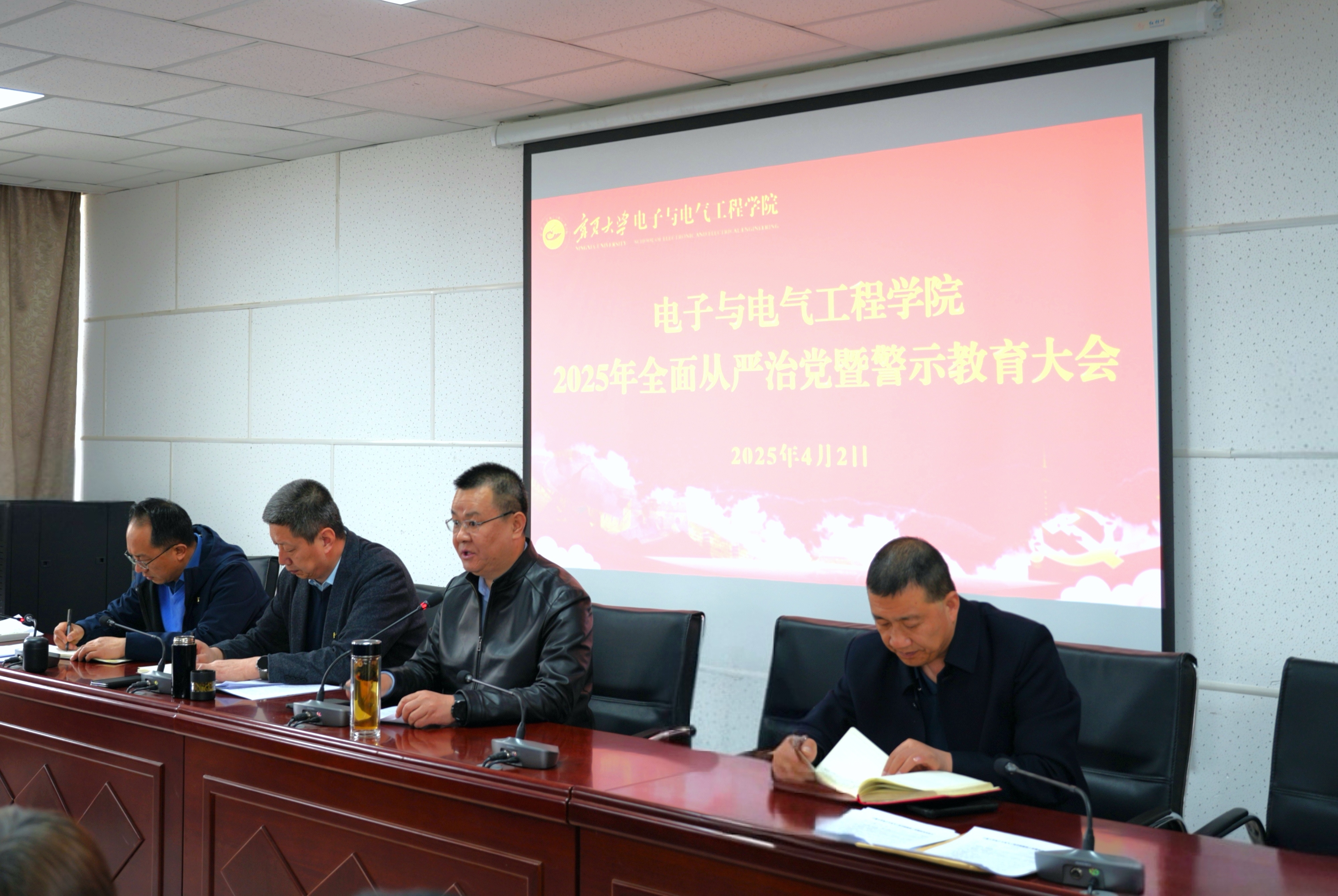 【电院讯 杨向红/文 朱佳/图】为深入学习贯彻习近平总书记关于党的自我革命的重要思想,学习贯彻学校2025年全面从严治党暨警示教育会议精神,落实全面从严治党主体责任,强化师德师风建设,筑牢廉洁从教防线,4月2日下午,我院在怀远校区博远楼221室召开2025年全面从严治党暨警示教育会议。学院领导班子及全体教师参会,会议由学院党总支书记何彦平主持。