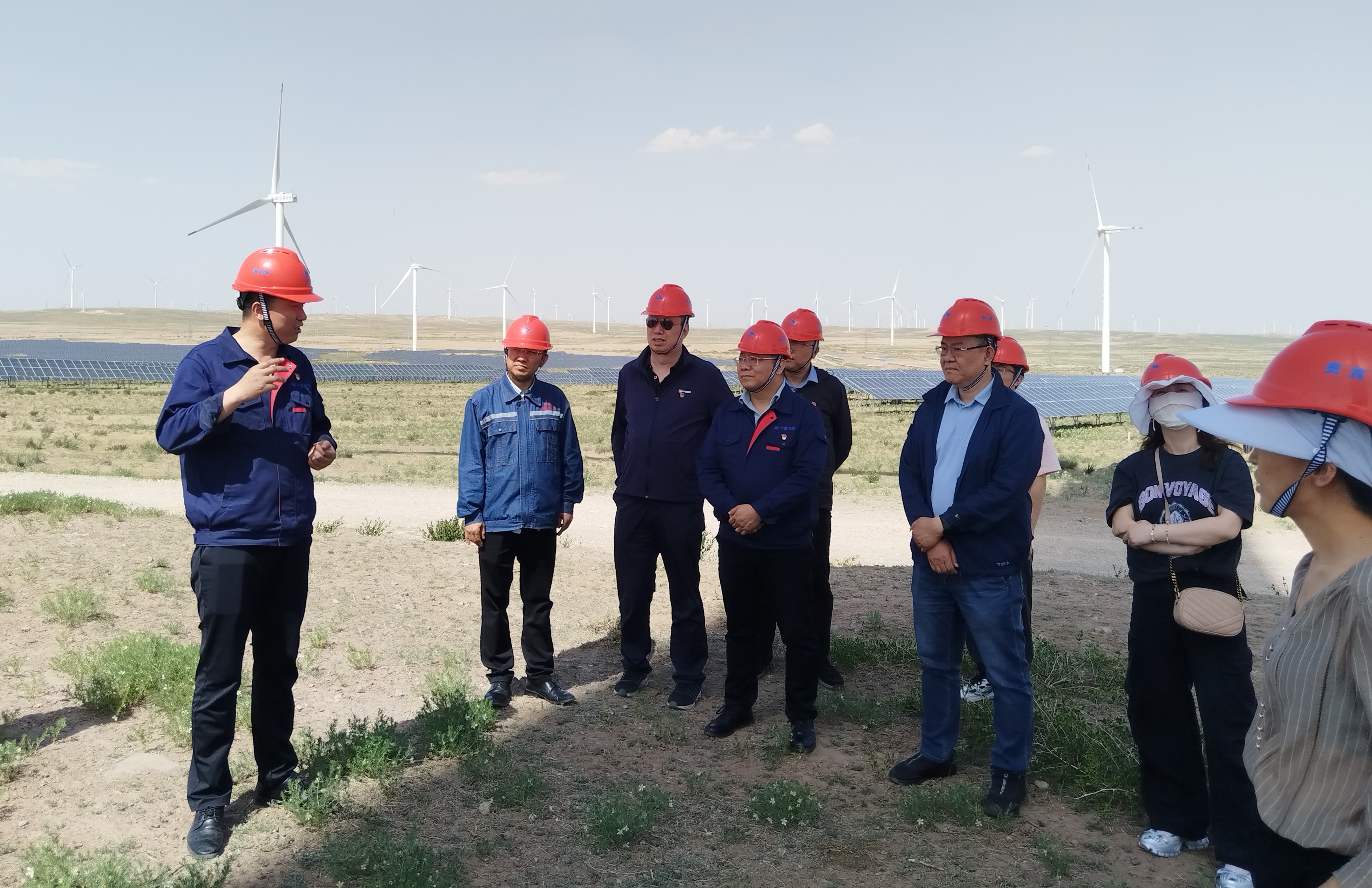 来到太阳山场站,在宁夏电投新能源公司党总支书记张怀畅等领导的带领和陪同讲解下,我系师生进入场站进行考察调研,深入了解的场站建设历程和发展规划、光伏风能电站的运营模式、技术创新、市场前景与发展趋势以及新能源在国家能源结构转型中的重要作用。