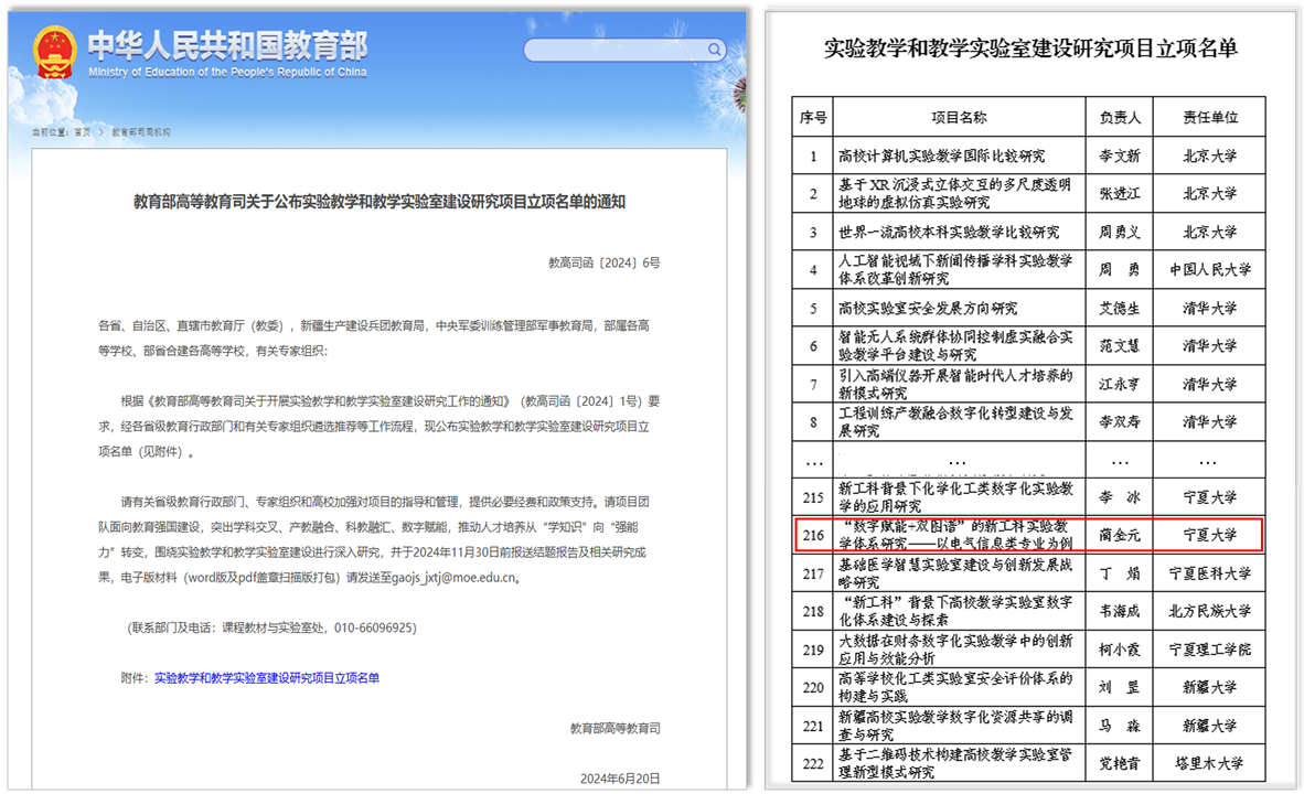 【电院讯 蔺金元/文、图】近日,教育部高等教育司公布了2024年实验教学和教学实验室建设研究项目立项名单,在宁夏高校获批的5个项目中,我院蔺金元教授牵头申报建设的《“数字赋能+双图谱”的新工科实验教学体系研究——以电气信息类专业为例》获批1项。