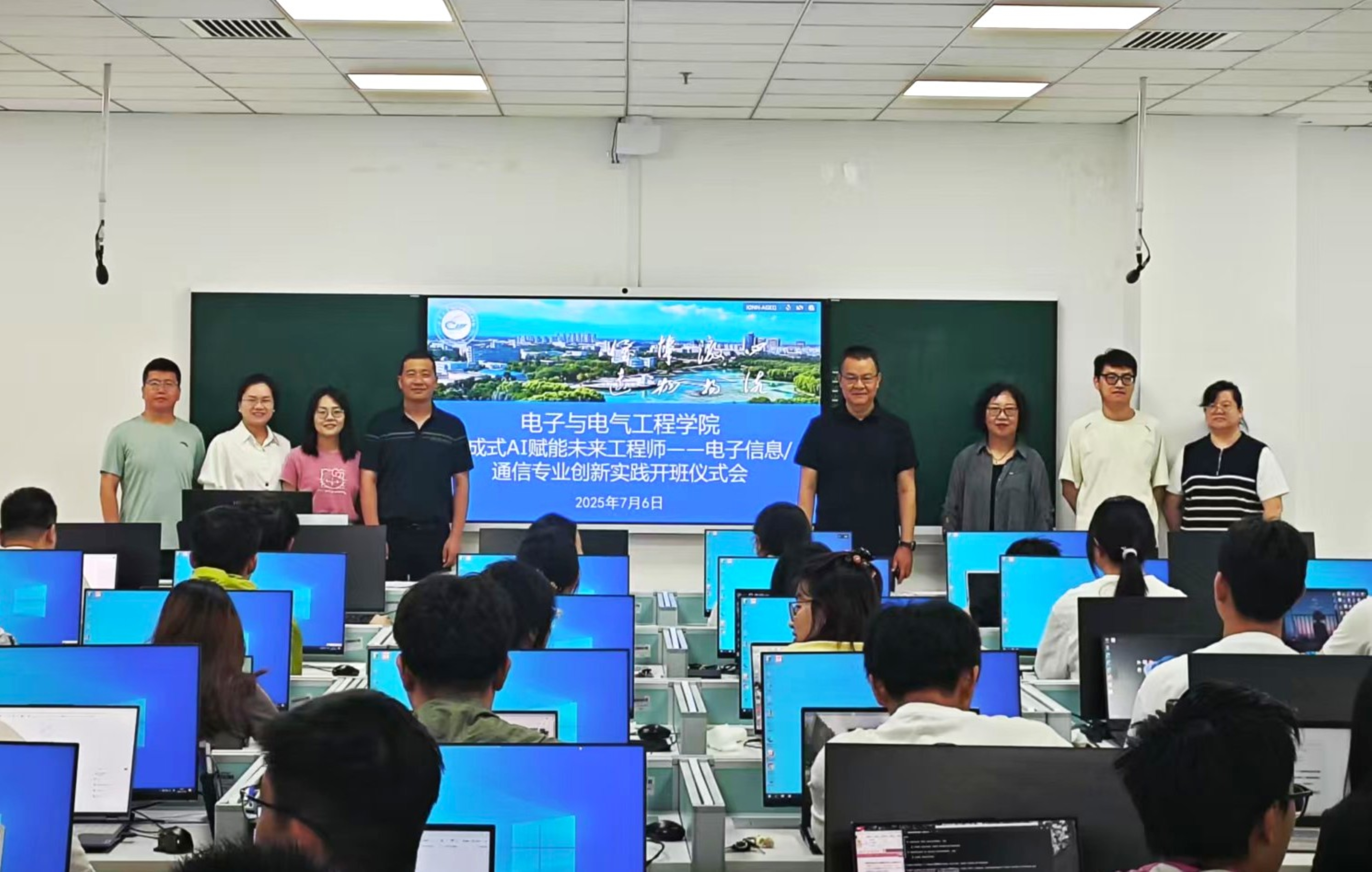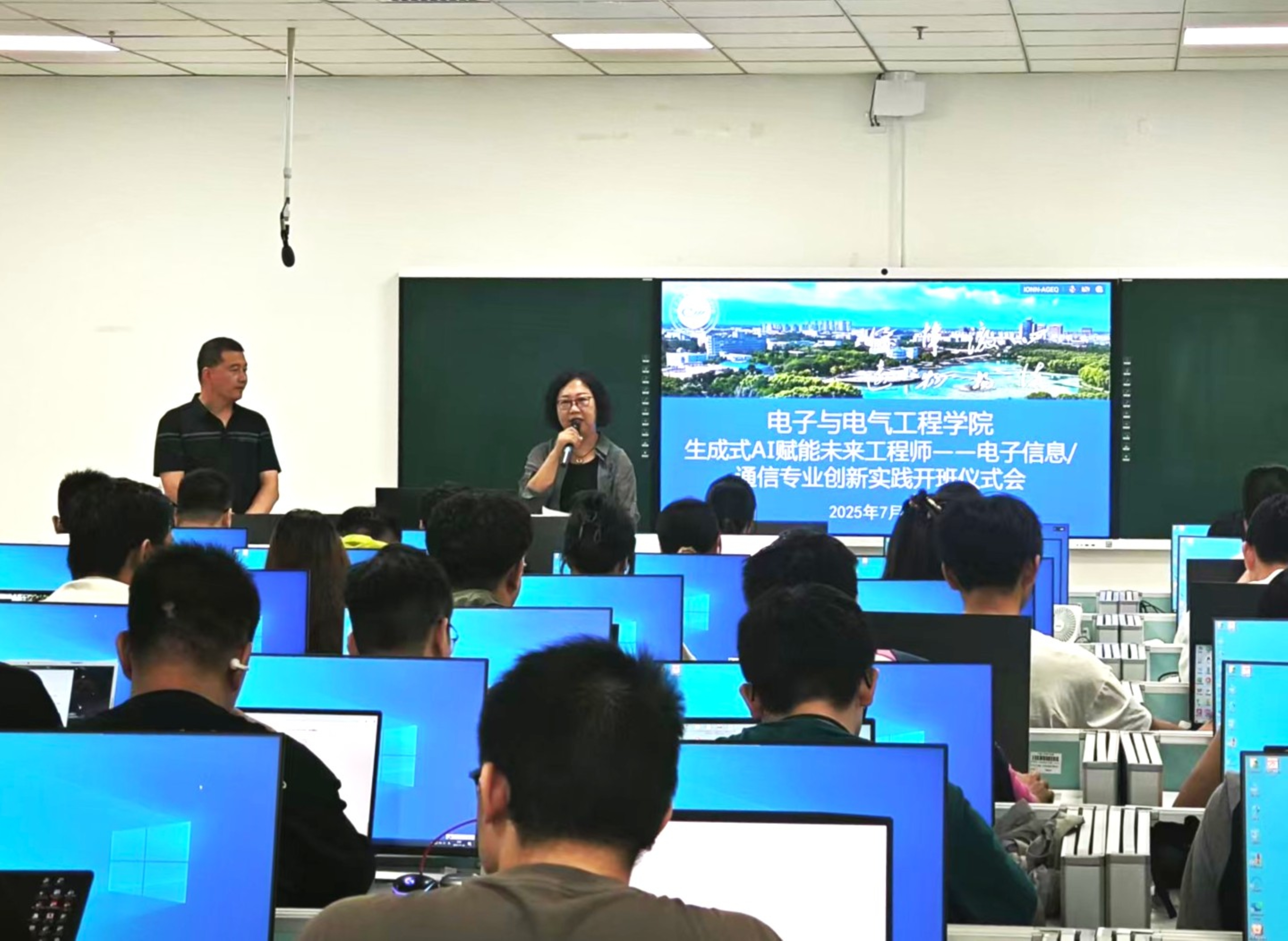 【电院讯 朱瑜红/文 覃国车/图】为深化前沿人工智能技术与专业核心能力培养的深度融合,着力培育面向未来的复合型工程人才,7月6日,我院在贺兰山校区笃行楼隆重举行“生成式AI赋能未来工程师——电子信息工程/通信工程专业创新实践”暑期课程开班式。学院领导、行业专家及2022级首批参训同学齐聚一堂,共同见证课程启动。开班仪式由学院副院长李春树主持。