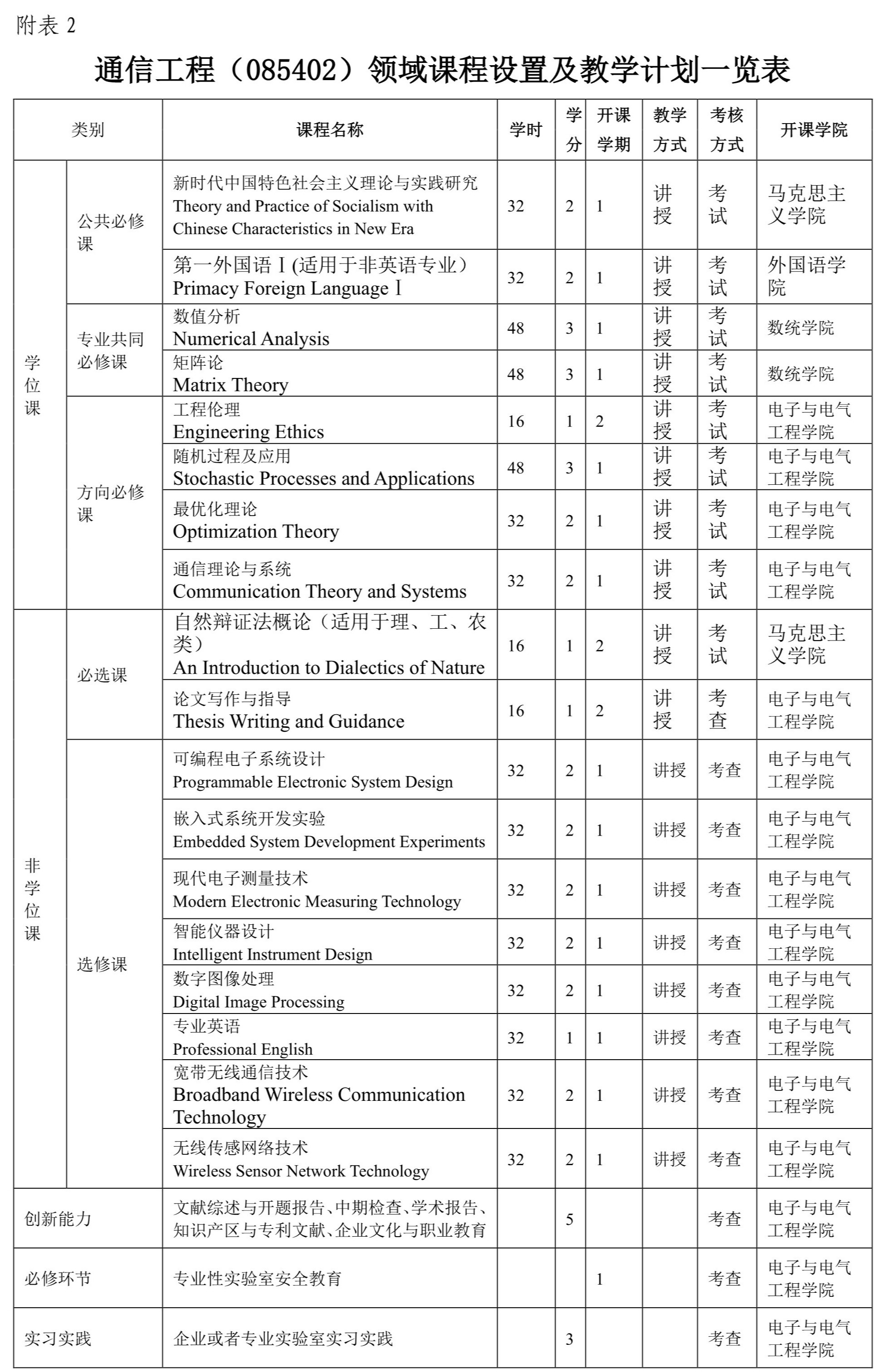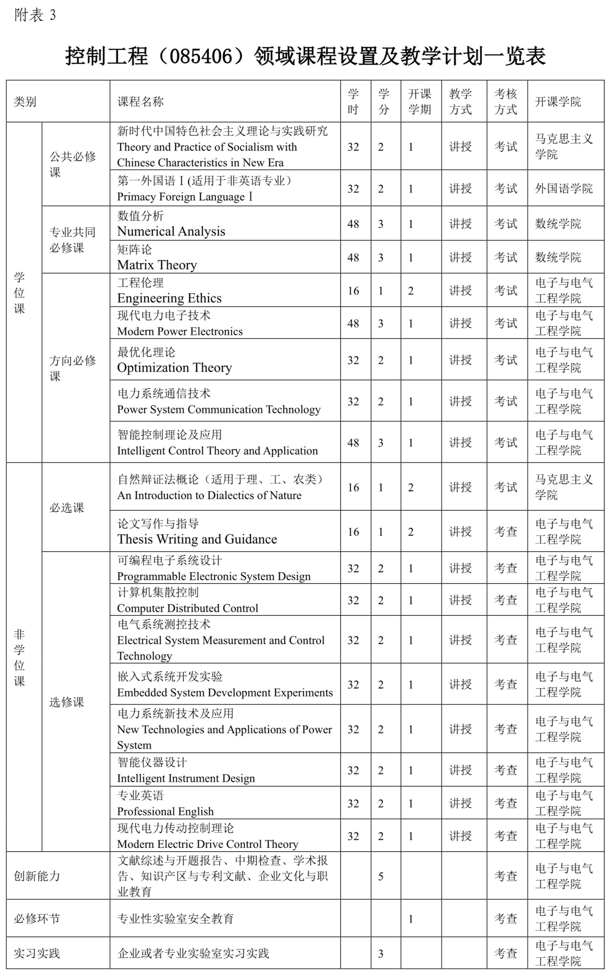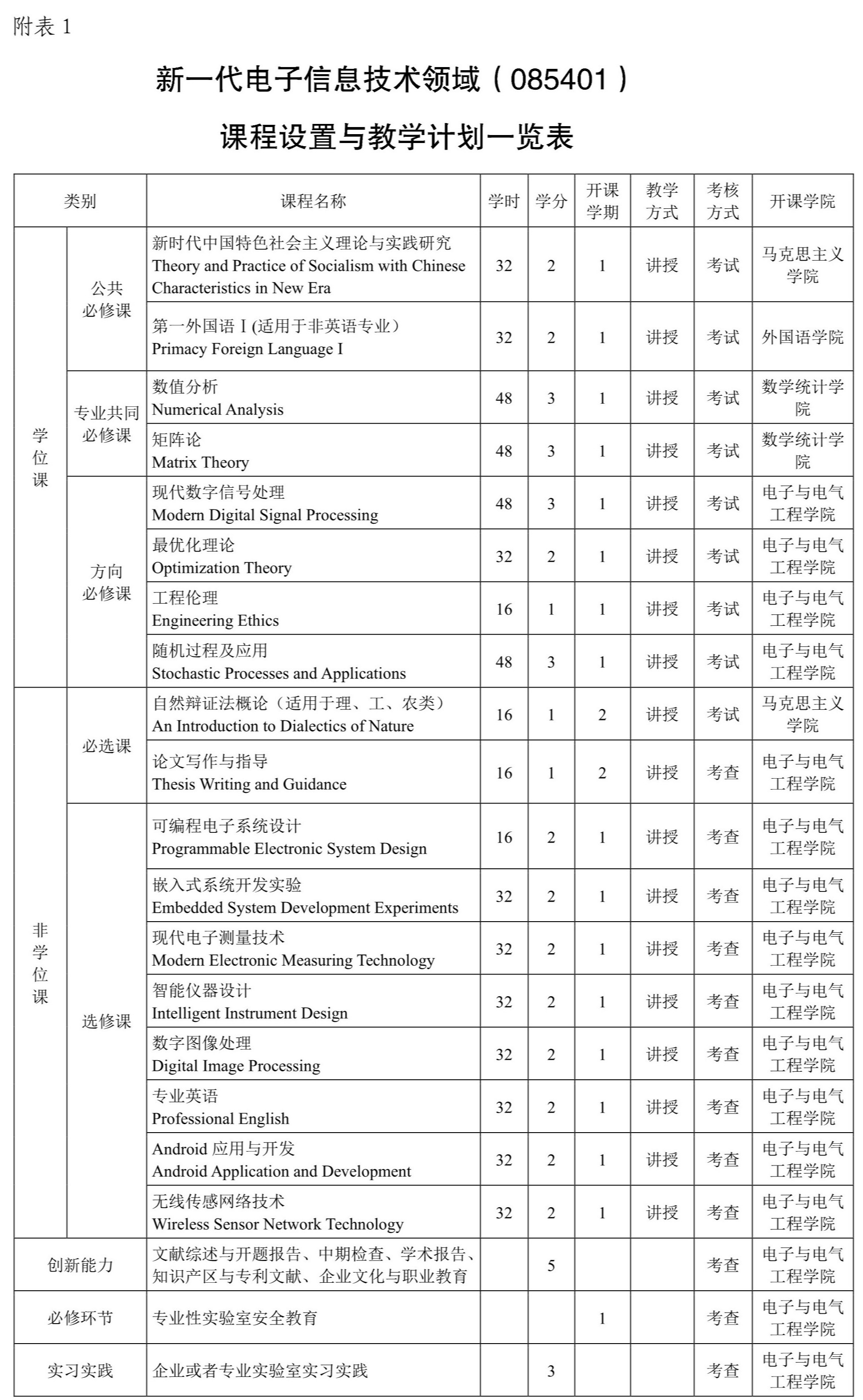 课程设置要以电子信息、能源电力等行业实际应用为导向,以职业需求为目标,以综合素养和创新能力的培养为核心。教学内容和课程设置要强调理论性与实践应用性课程的有机结合,突出案例分析和实践研究,教学过程要重视运用团队学习、混合式教学、模拟训练等方法;课程设置分为学位课、非学位课和实践创新三个模块,学位课分为公共学位课和专业学位课两部分,16学时计1学分。学分要求:最低32学分,最高38学分。其中公共学位课5学分(含外语2学分、政治理论2学分、工程伦理1学分),专业学位最低13学分(含数值分析3学分、矩阵论3学分,其他专业学位课7学分),专业非学位课最低6学分,实践创新环节8学分(含文献综述与开题报告1学分,企业文化与职业教育1学分,中期检查报告1学分,知识产权与专利文献撰写1学分,企业实践基地或者校内外专业实验室实习实践3学分、学术报告1学分。必修环节的专业性实验室安全教育是研究生进入实验室进行科学研究的必修教学环节,要求在研究生入学第一学期完成由学校实验室与资产管理处开设的实验室安全网络培训课程学习,并参加网络在线考试取得合格证。