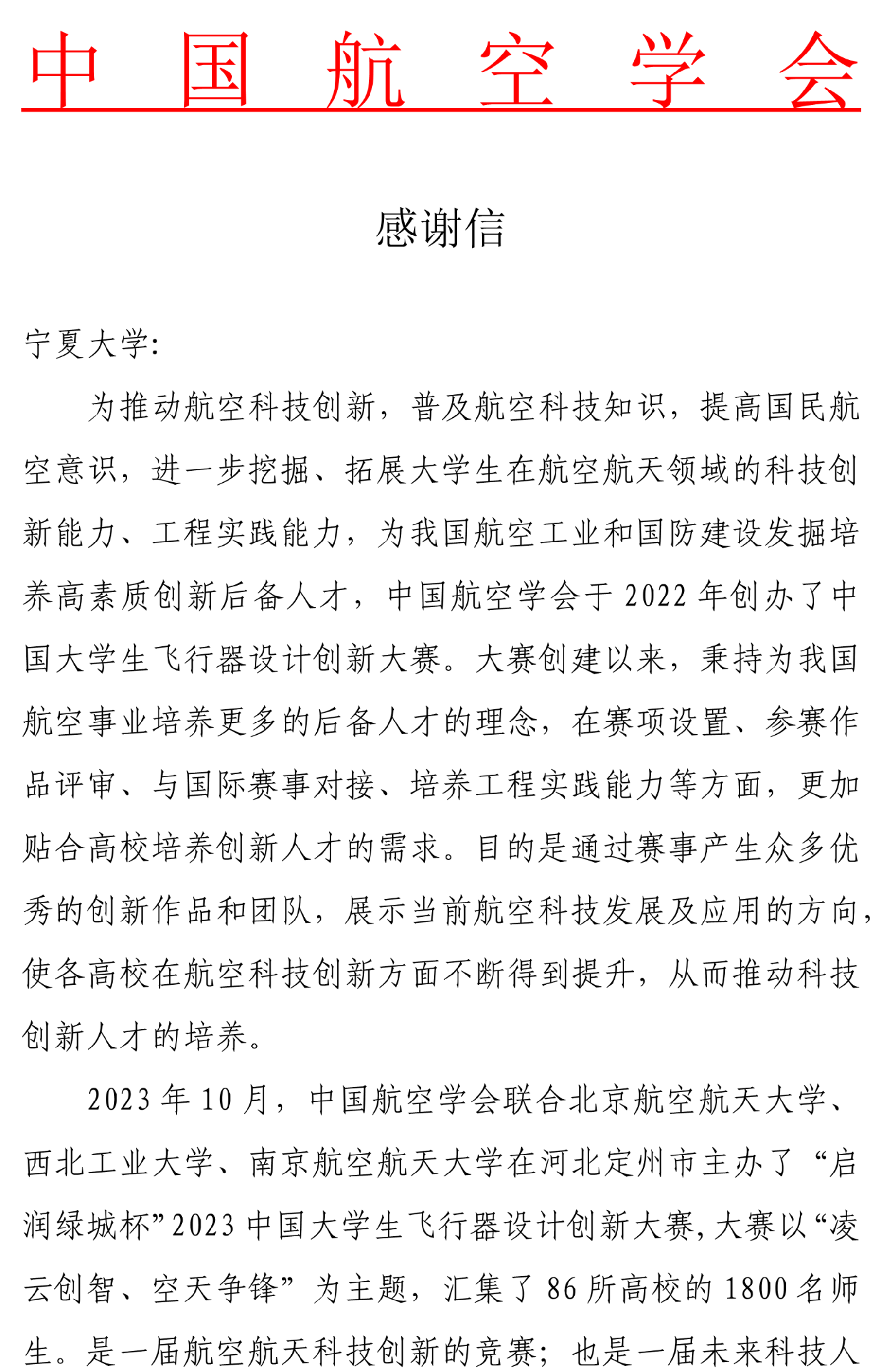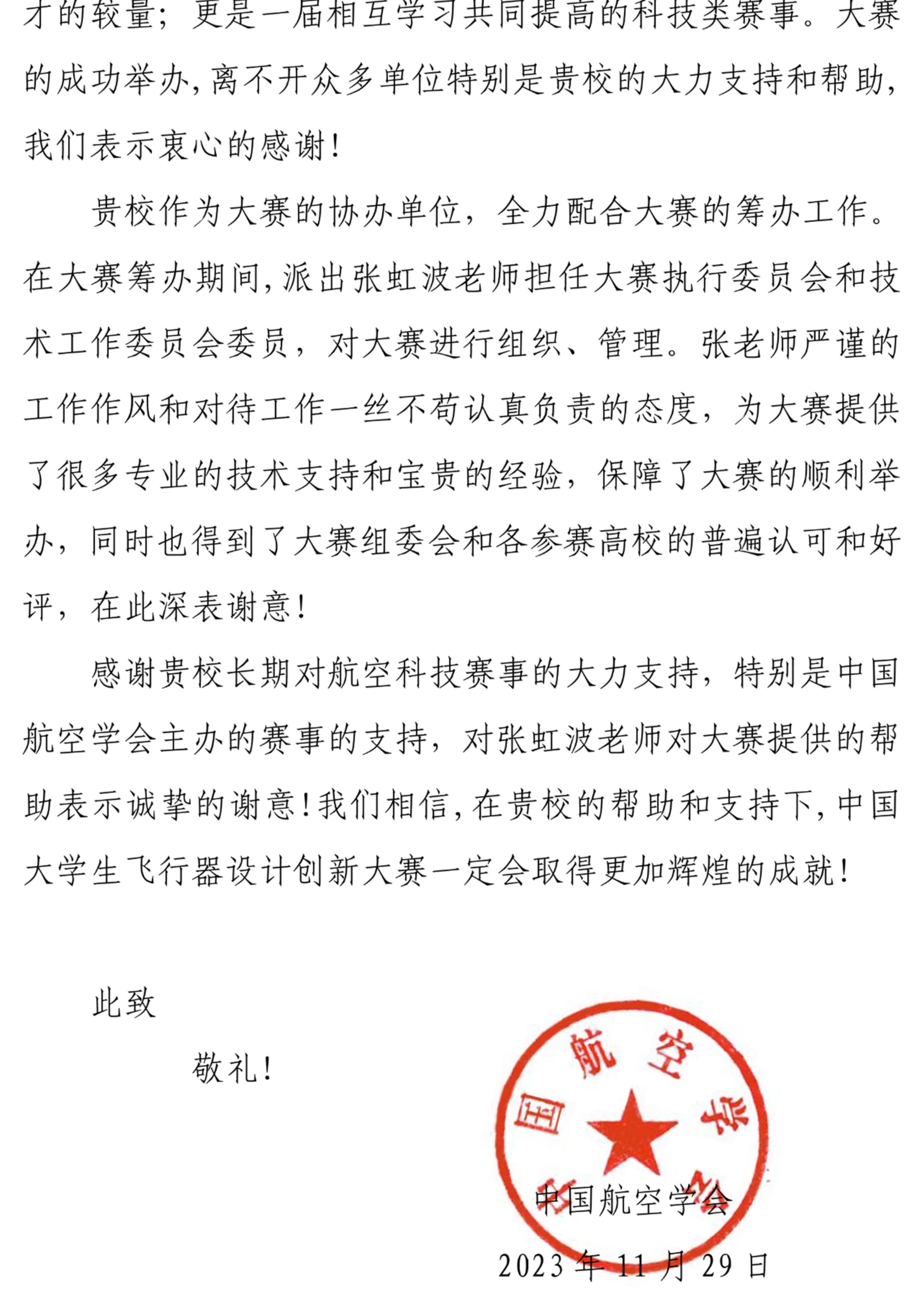 【电院讯 万艳妮/文、图】近日,中国航空学会向3003新葡的京发来感谢信。对我校长期以来支持和帮助对中国航空学会主办的航空科技赛事表示衷心感谢,对我校张虹波老师对大赛提供的专业技术支持和宝贵经验表示诚挚谢意。