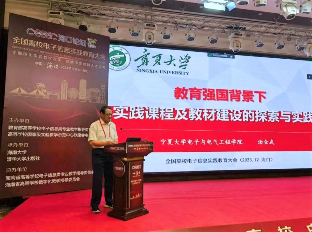 我院电子与通信工程专业基础课教研室主任、宁夏高校专业类思政教材研究基地首席专家、秘书长、高等学校电路和信号系统教材与研究会常务理事、西北地区高等学校电工电子在线开放课程联盟理事、国家一流课程负责人汤全武教授受邀作了题为“教育强国背景下实践课程及教材建设的探索与实践”的大会报告。报告从建设背景与使命、实践课程建设、新形态教材建设、建设实践与成效四个方面作了阐述,分享了国家一流课程的建设经验,介绍了新形态教材建设的建设标准与评价指标、特点与优势,提出了“虚实结合,分层递进”的实验教学体系,以“OBE为导向”构建新目标,以“学为中心”打造新教材,以“学科实践”推进新教学,以“促进学习”开展新评价,总结了学院近年来积极响应新工科人才培养要求在实践教学和教材建设方面的经验与成果。其报告获得了与会专家和同行老师的高度赞誉。