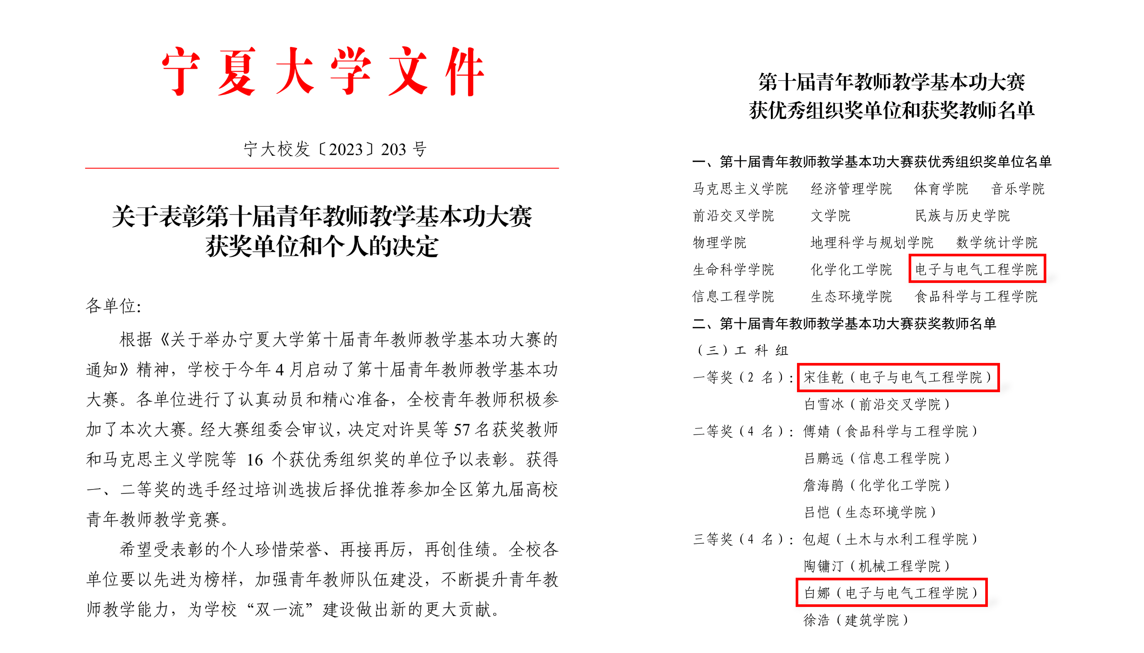 【电院讯 覃国车/文、图】近日,学校发文《关于表彰第十届青年教师教学基本功大赛获奖单位和个人的决定》,我院青年教师宋佳乾以工科组第1名的优异成绩斩获一等奖。