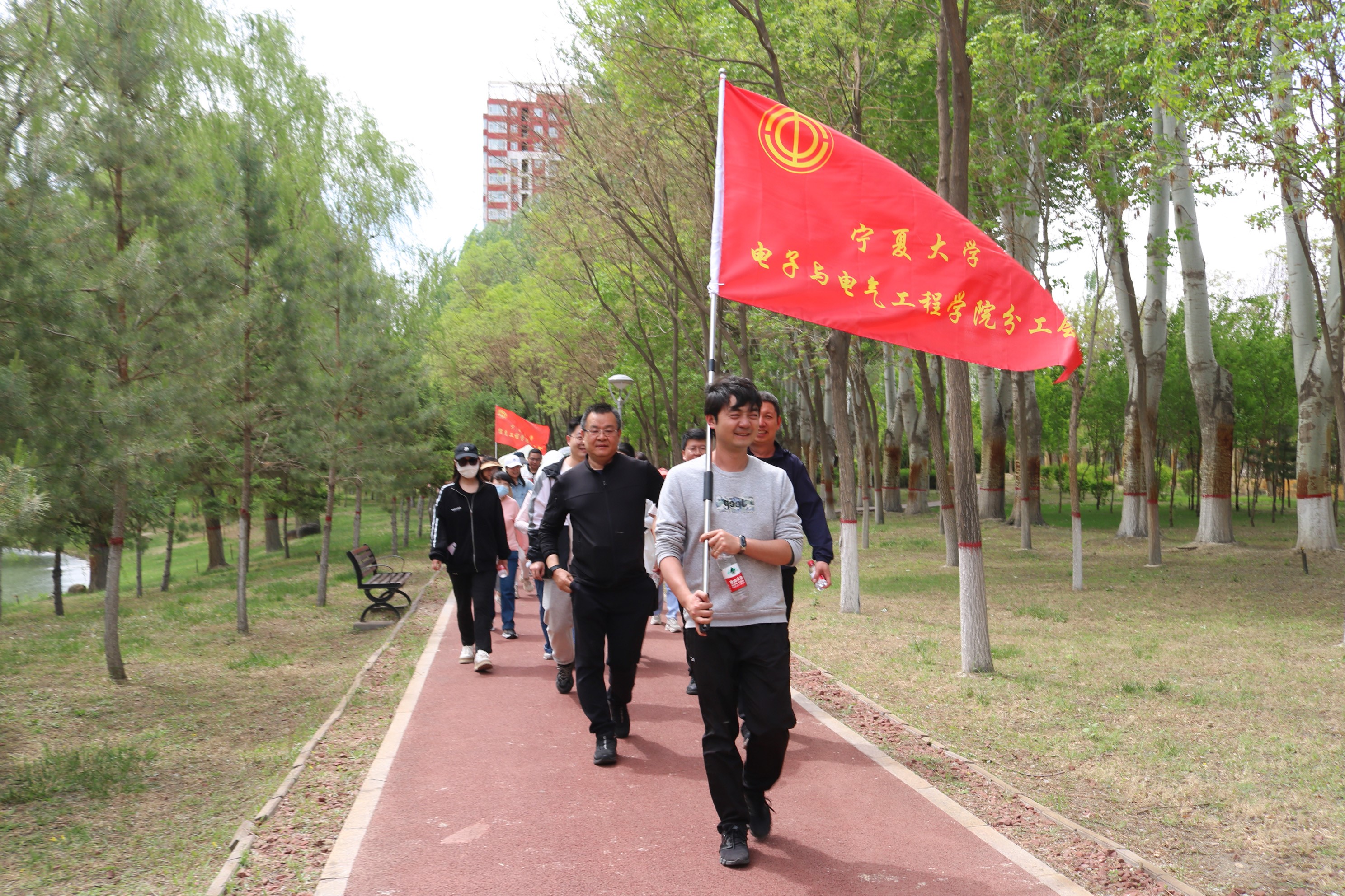 在学院分工会会旗的指引下,我院教师以高昂的精神状态和饱满的活动激情从凌云广场出发,沿着金波湖健身步道,跨过天桥,步入贺兰山校区,在贺兰山校区绕行一周后再次跨过天桥,返回凌云广场。在近7公里的健步走活动中,老师们个个精神饱满,兴致高昂,沿途充满着老师们的欢声笑语,老师们在沿途中欣赏校园春光的同时,增进了感情,提升了凝聚力。