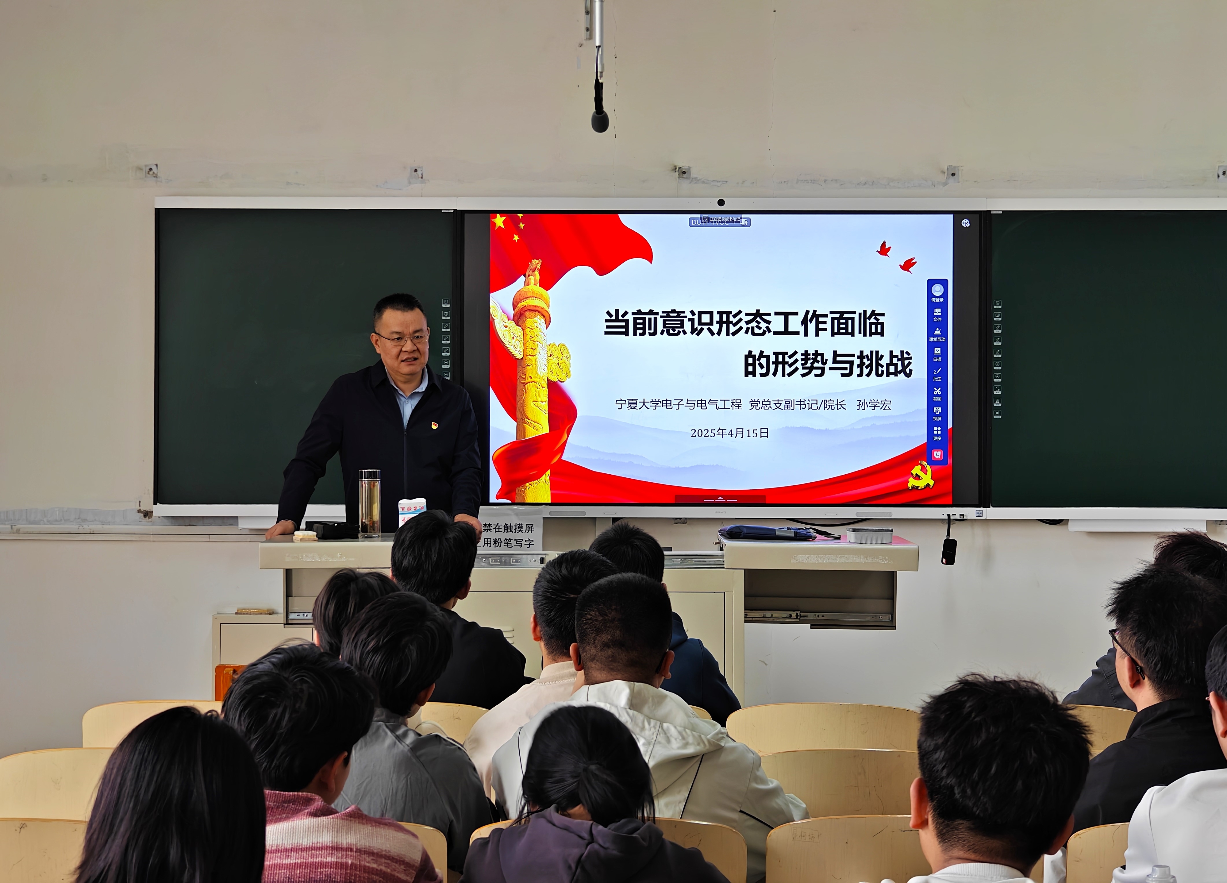 4月15日下午,孙学宏来到怀远校区1教221教室,为2022级电气工程及其自动化专业1班学生讲授“当前意识形态工作面临的形势与挑战”专题安全政策课。他结合当前国际国内形势和实际案例,深入浅出地阐述了国家安全的重要性。他强调新时代大学生应牢固树立总体国家安全观,增强安全防范责任意识,自觉维护国家利益。作为工科学生,在技术研发和创新中更要严守安全底线,为国家安全贡献专业智慧和力量。